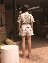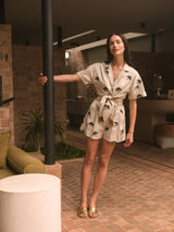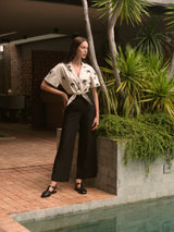 Be ready rain or shine with our embroidered swaying palm trees. Made as a boxy crop shirt, the fit is tailored with extended sleeves and a tie front detail. Structured with drop shoulders to flatter the arms, crafted in a cropped length to balance proportions. Pairs seamlessly with the matching Beige Palm Shorts or with any bottoms in black, white or denim, possibilities are endless!
