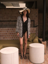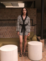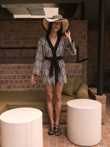 The Black Diamond Kaftan is a short kaftan with a wrap silhouette, a snap button at the chest, a fabric tie belt, jagged hems and embroidery detail throughout. Made from 100% Combed Cotton for a crispness, comfort and excellent absorption.