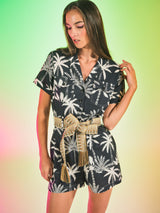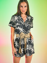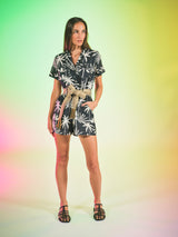 The Black Palms Playsuit is a relaxed playsuit with a collared neckline, short cuffed sleeves, roomy side pockets, a woven belt tie and square coloured buttons. Made from100% Linen for comfort, durability and excellent absorbency.