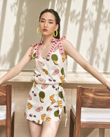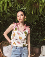 Durians, mangosteen, papayas, bananas, you name it - this Fruit Stall has it! Structured to be loose, this easy breezy top is cut with just the right amount of volume when tucked in. Completed with contrast bows tied into the perfect size, this level of cuteness is tough to resist. Pair with our Fruit Stall Shorts for pure joy or with denim, white or denim bottoms for a pop of fun.