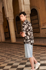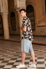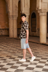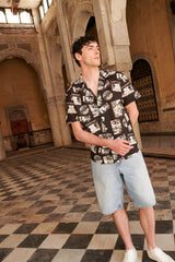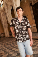 The MB9 Shirt is a printed aloha shirt featuring a convertible camp collar, short sleeves, a drop cut hem, topstitch detailing and natural shell buttons. Interior French seams. Made from 100% Mercerized Cotton Sheeting for crispness, breathability and durability.