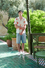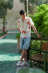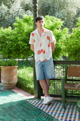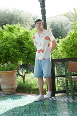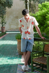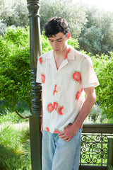 The MB9 Shirt is a printed aloha shirt featuring a convertible camp collar, short sleeves, a drop cut hem, topstitch detailing and natural shell buttons. Interior French seams. Made from 100% Mercerized Cotton Sheeting for crispness, breathability and durability.