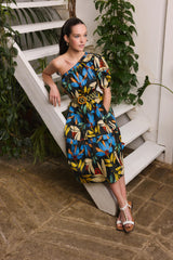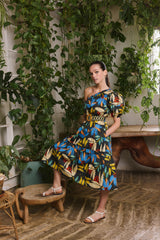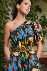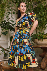 The Brushstroke Blooms dress is a fit and flare dress with an asymmetrical neckline, a single puffy sleeve with an elasticated cuff, side pockets and a tiered skirt. Made from 97% Combed Cotton Poplin and 3% Spandex for crispness, comfort and shape retention.