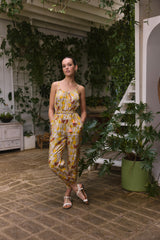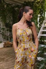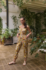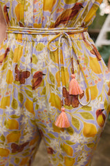 The Lemons jumpsuit is a sleeveless jumpsuit with a gathered neckline, an elasticated waist, high-waisted jogger pants and a string belt with contrast tassels. Made from 100% Viscose for a smooth handfeel and slinky drape.