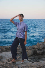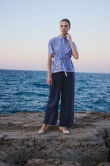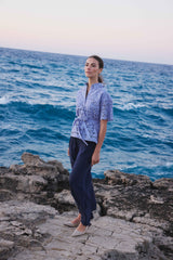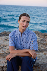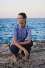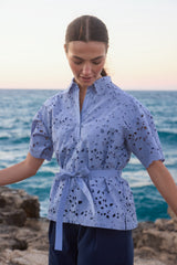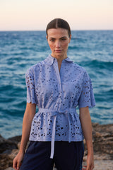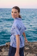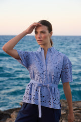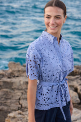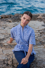 Calm your senses with this embroidered floral lace shirt. Crowned with a beautiful collar, this shirt is to be worn with its matching belt or tucked in. Designed to effortlessly pair with most bottoms, skirts, pants, or shorts of white or navy would fare equally well. Complete the look with the Porto Ercole Pants in Navy or Off White. Made from 100% Cotton and for comfort and breathability.