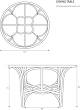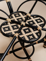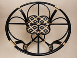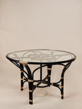 A round natural rattan dining table in a black finish with a handwoven flower shaped centerpiece and handwoven panel depicting an indigenous Iban pattern. Panel weave in synthetic rattan. Handbound detailing in natural rattan. Tempered glass tabletop.