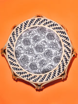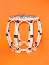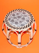 A natural rattan drum stool with a black and white jacquard upholstered seat depicting peonies and a handwoven rim incorporating an indigenous Orang Ulu pattern. Rim weave and handbound detailing in black and natural-coloured synthetic rattan.