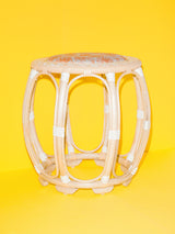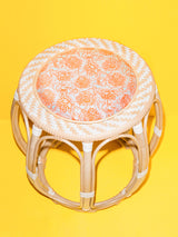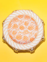 A natural rattan drum stool with an orange and white jacquard upholstered seat depicting peonies and a handwoven rim incorporating an indigenous Orang Ulu pattern. Rim weave and handbound detailing in white and natural-coloured synthetic rattan.
