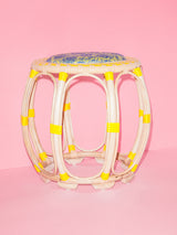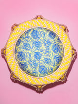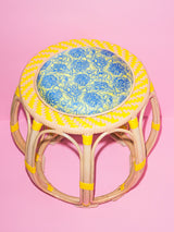 A natural rattan drum stool with a blue and yellow jacquard upholstered seat depicting peonies and a handwoven rim incorporating an indigenous Orang Ulu pattern. Rim weave and handbound detailing in yellow and natural-coloured synthetic rattan.