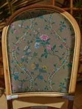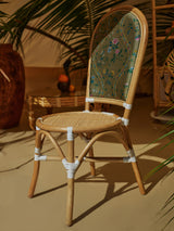 A natural rattan dining chair with an embroidered jacquard upholstered backrest and a machine woven seat. Seat weave in natural rattan, handbound detailing in synthetic rattan.