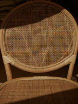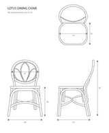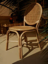 A natural rattan dining chair with a backrest depicting a handmade lotus and a handwoven seat. Lotus, backrest weave, seat weave and handbound detailing all in natural rattan.