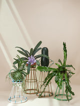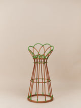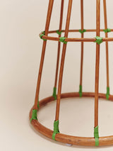 A natural rattan tall standing planter in a brown finish with intricate handbound detailing in light green synthetic rattan.