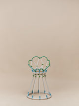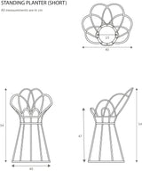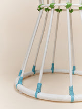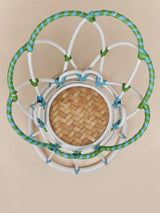A natural rattan short standing planter in a white finish with contrast intricate handbound detailing in light blue and light green synthetic rattan.