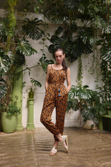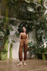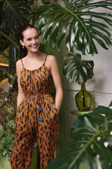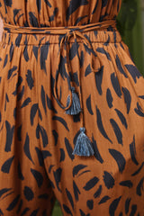 The Brown Strokes jumpsuit is a sleeveless jumpsuit with a gathered neckline, an elasticated waist, high-waisted jogger pants and a string belt with contrast tassels. Made from 100% Viscose for a smooth handfeel and slinky drape.